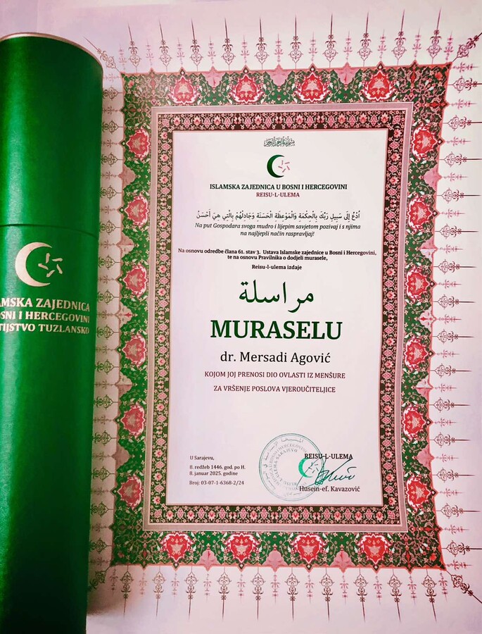 Čestitamo našoj kolegici Mersadi Agović, profesorici Islamske vjeronauke u JU Srednjoj ekonomsko-trgovinskoj školi Tuzla, koja je dobila muraselu potpisanu od strane reisu-l-uleme Islamske zajednice u Bosni i Hercegovini, dr. Husein-ef. Kavazovića.