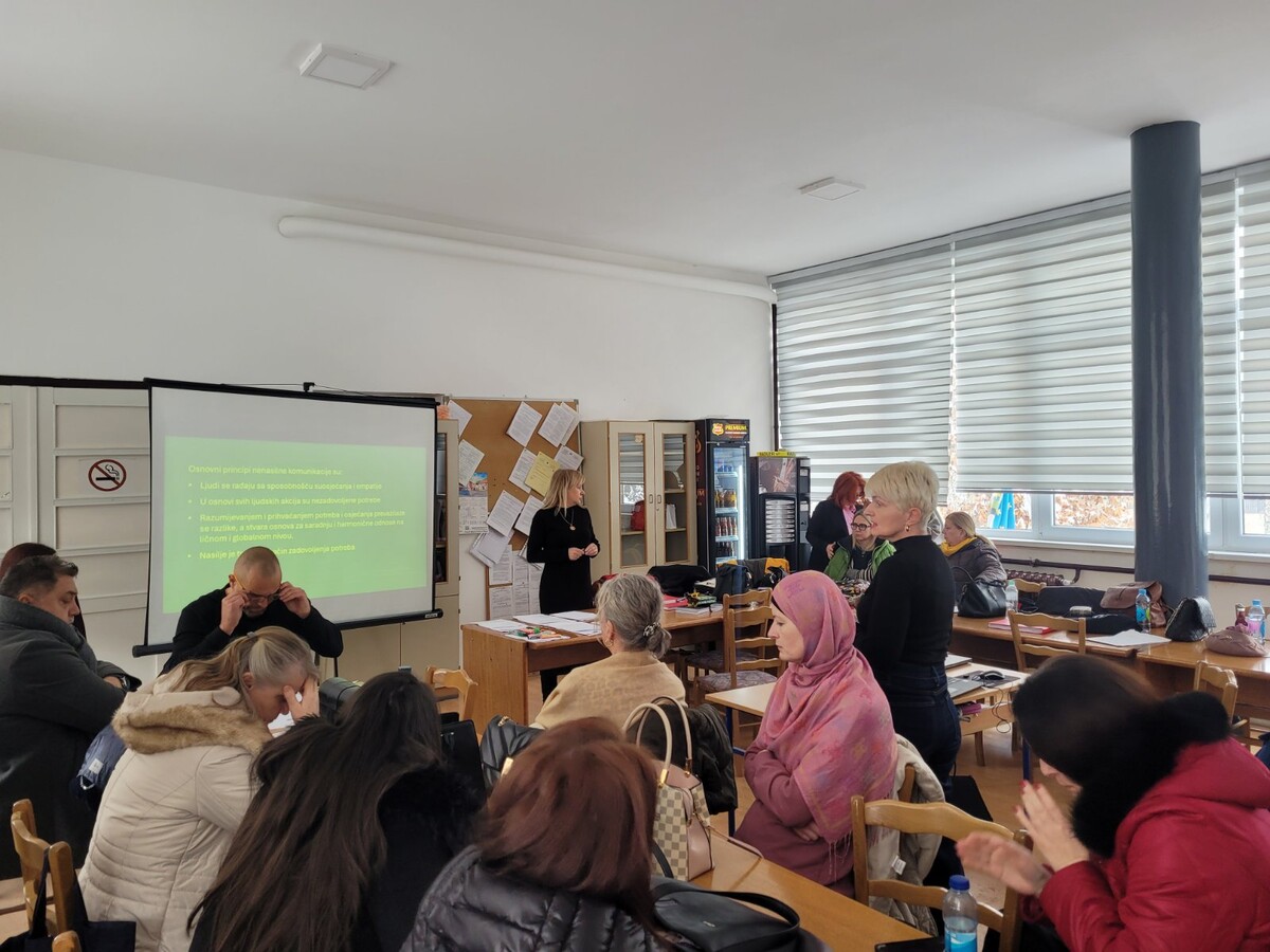 Na Nastavničkom vijeću, održanom 09.01.2026. godine, realizovana je radionica na temu „Nenasilna komunikacija“. Radionicu su vodile profesorice Bašić Vilma i Palavrić Indira, koje su kroz razgovor, primjere i vježbe ukazale na značaj ovakvog načina komunikacije u svakodnevnom radu i međuljudskim odnosima. Poseban akcenat stavljen je na razumijevanje, povezivanje i mirno rješavanje konflikata, kao osnovne vrijednosti nenasilne komunikacije.